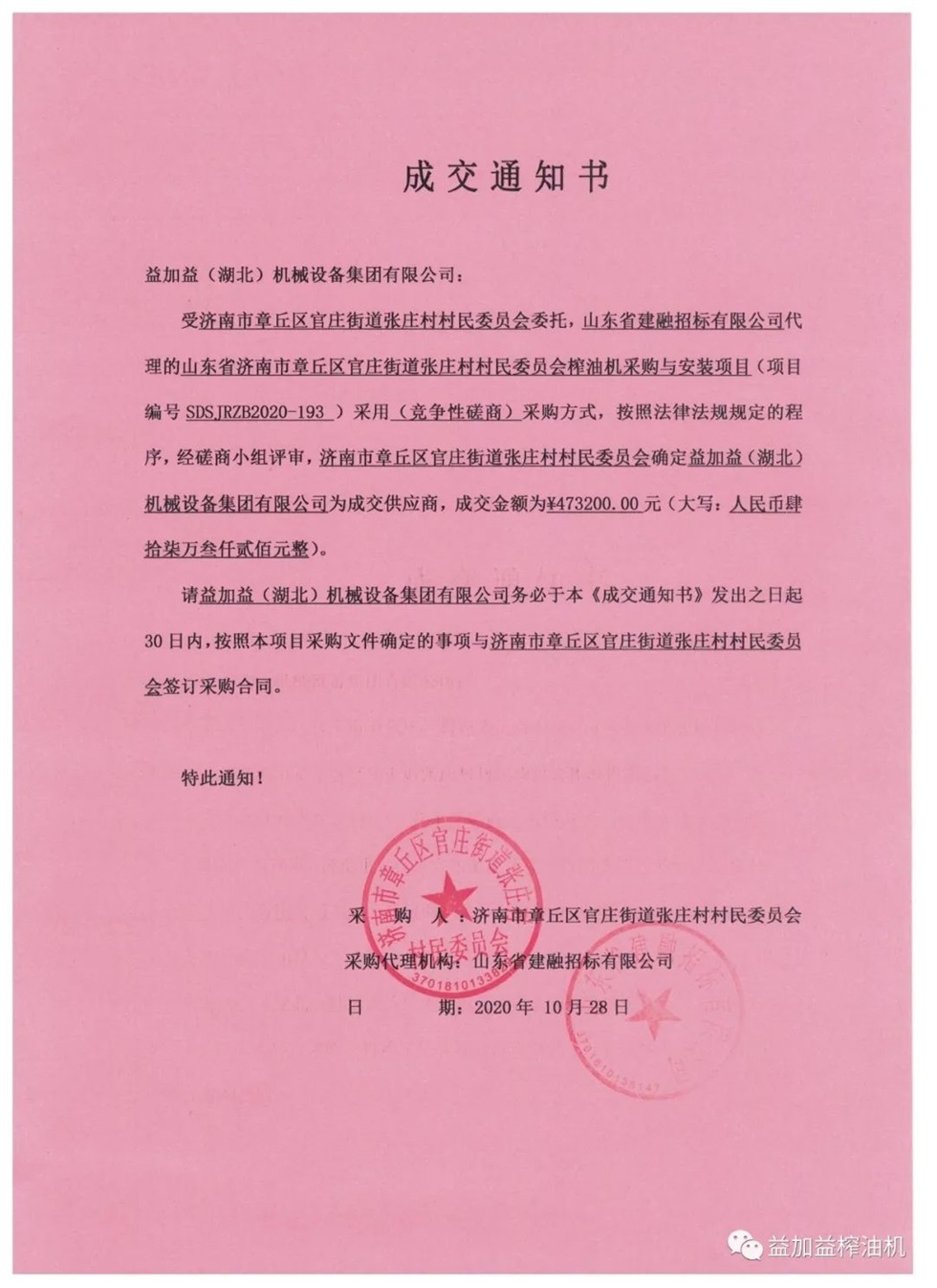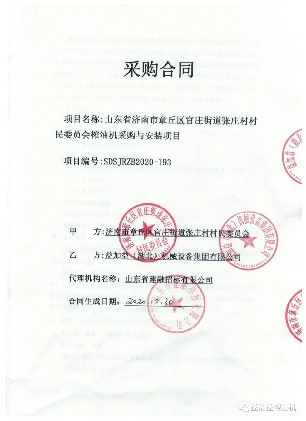 最近、益加益集团在山东省济南市章丘区榨油机采购与安装招标项目的竞标中,凭借过硬的产品质量,优秀的新技术,卓越的新工艺,新材料的应用以及良好的企业信誉,以绝对优势顺利中标。