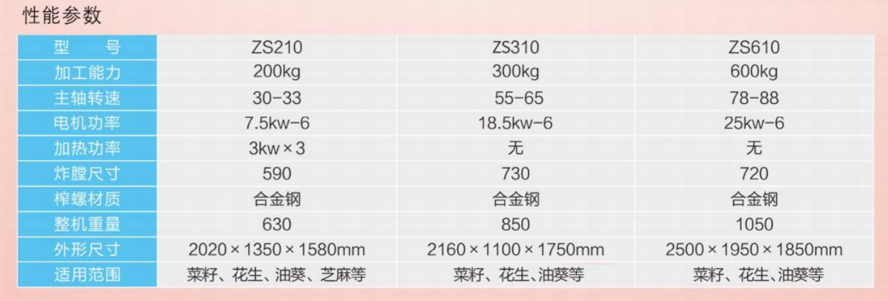 1、适合熟榨菜籽、花生、芝麻、油葵等油料;